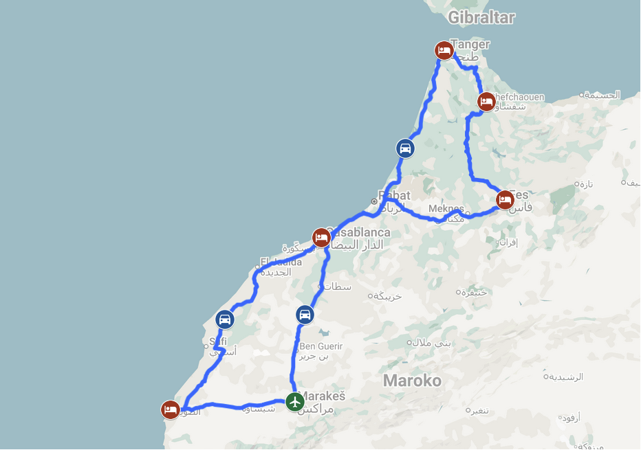 Doživite pravo bistvo Maroka v svojem ritmu – z najetim avtomobilom, ki vam omogoča popolno svobodo raziskovanja. Od živahnega Marakeša do duhovnega Fesa, modrega Chefchaouena, severnega Tangerja, mogočnih ulic Casablance in umetniške Essaouire. Potovanje razkriva mavrske palače, labirinte medin, barvite tržnice in spokoj Atlantske obale – vse skozi doživetja, ki jih krojite sami.